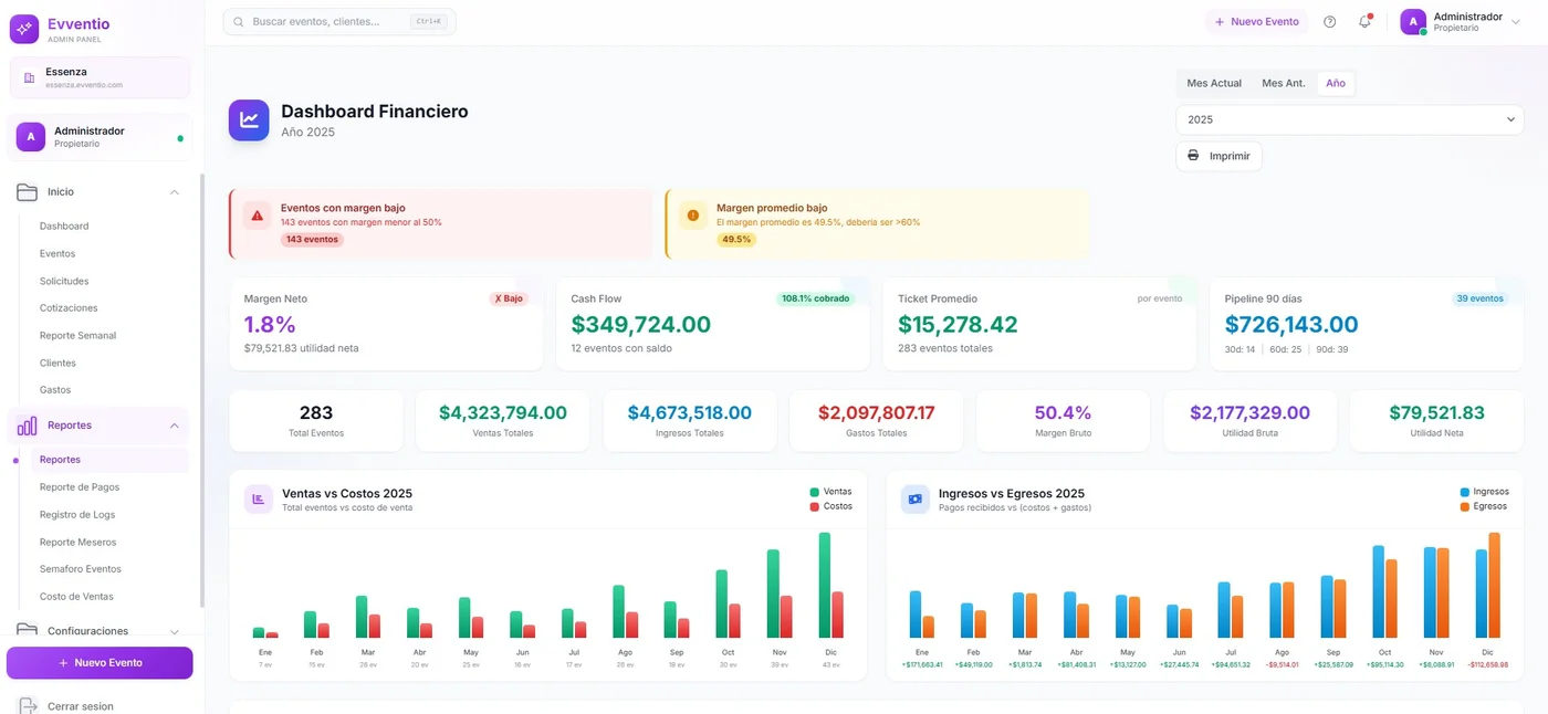Desde la cotización hasta el día del evento. Costos, márgenes, pagos y configuración en un solo lugar.